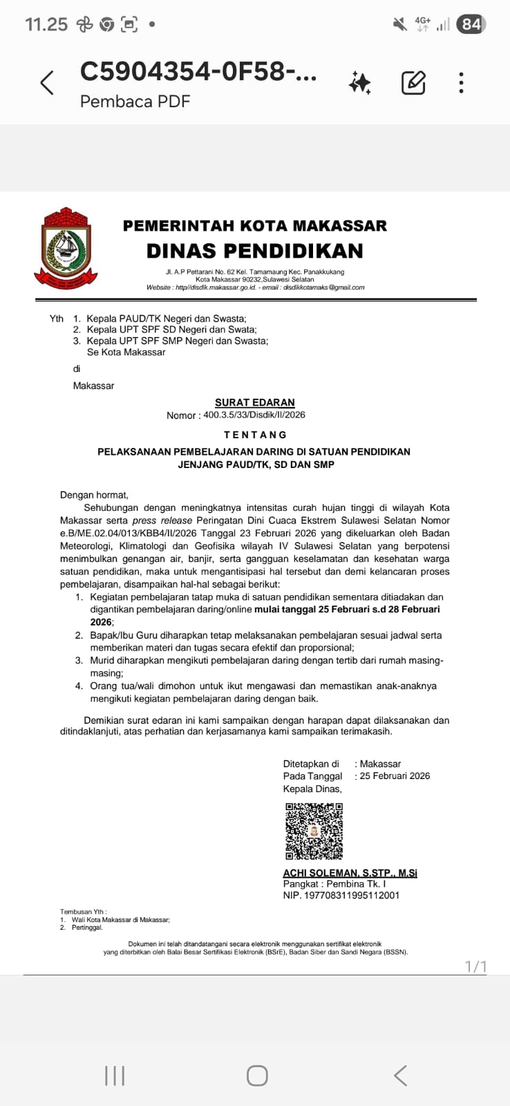 Surat Edaran bernomor 400.3.5/33/Disdik/II/2026 ditanda tangani Kepala Disdik Makassar, Achi Soleman yang diterbitkan, Rabu, (25/2/2026).