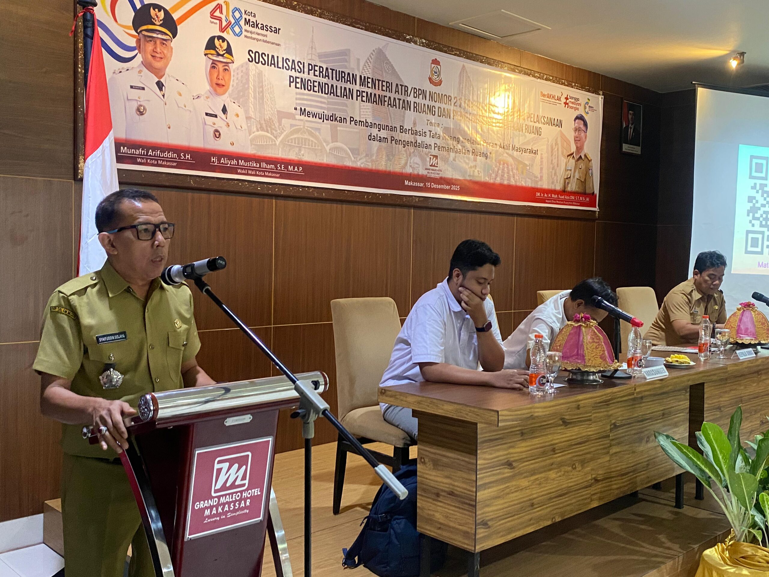 Makassar, allnatsar.id — Dinas Penataan Ruang (Distaru) Kota Makassar melaksanakan Sosialisasi Peraturan Menteri ATR/BPN Nomor 21 Tahun 2021 tentang Pelaksanaan Pengendalian Pemanfaatan Ruang yang menyasar Kecamatan Wajo, Ujung Tanah, dan Kepulauan Sangkarrang. Kegiatan ini berlangsung di Hotel Grand Maleo Makassar, Senin, 15 Desember 2025.